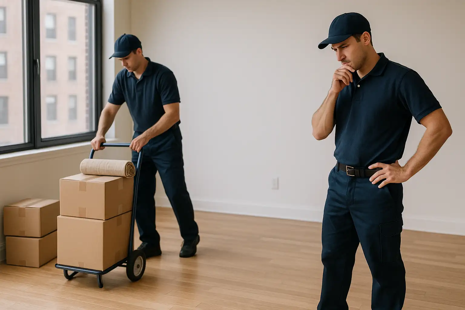Alt text for image: Two professional NYC movers carrying minimal household furniture out of a modern apartment, reflecting the declining volume of moves and shrinking profitability in the moving industry.